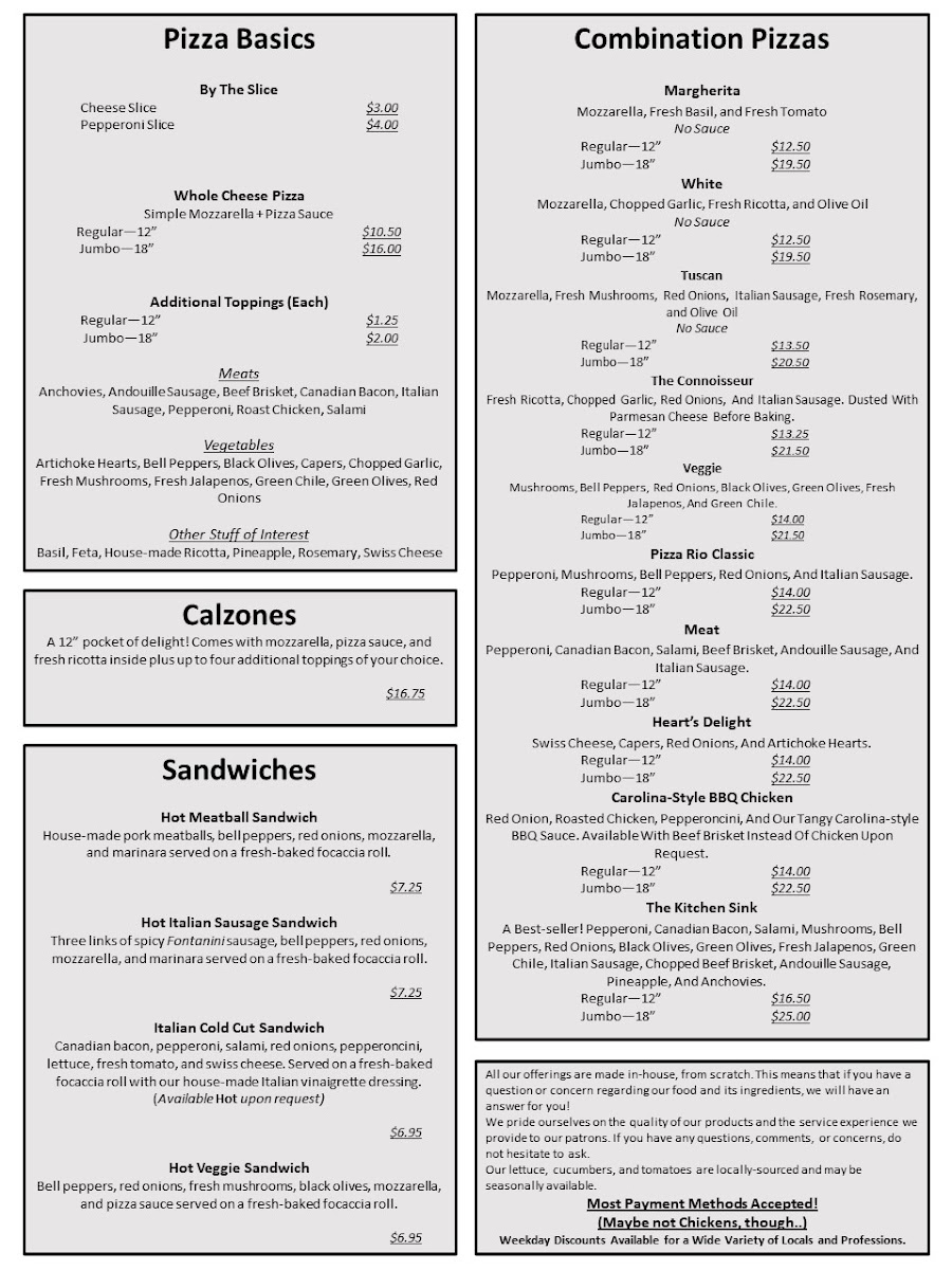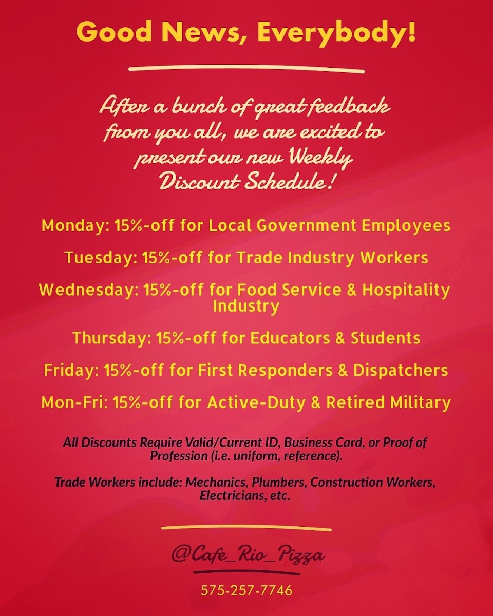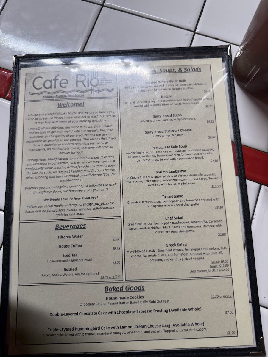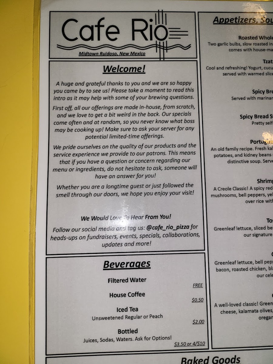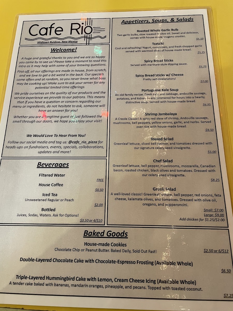 Welcome to Cafe Rio Pizza, a culinary gem nestled in the heart of Ruidoso, NM. Renowned for its tantalizing selection of signature combination pizzas, the menu is a delightful journey for pizza lovers. Highlights include the Connoisseur, boasting fresh ricotta and Italian sausage, and the vibrant Veggie, a delightful mix of mushrooms and jalapeños.